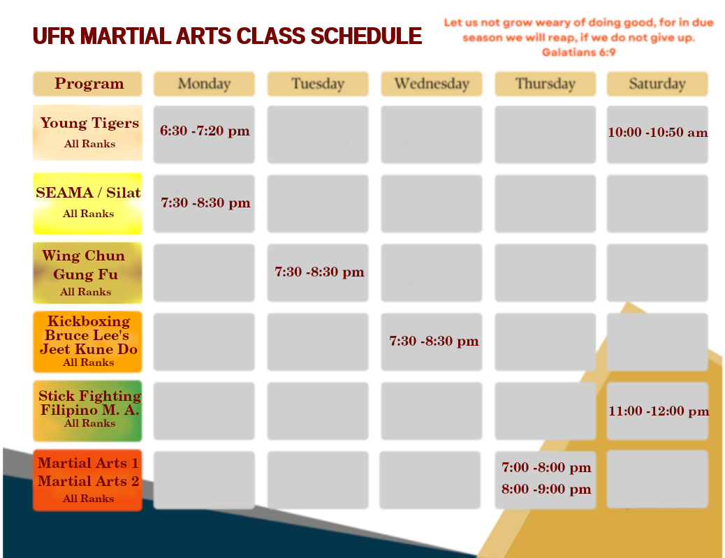 Schedule is subject to change at the instructor's discretion. Private instruction may be requested whenever classes are not being held.